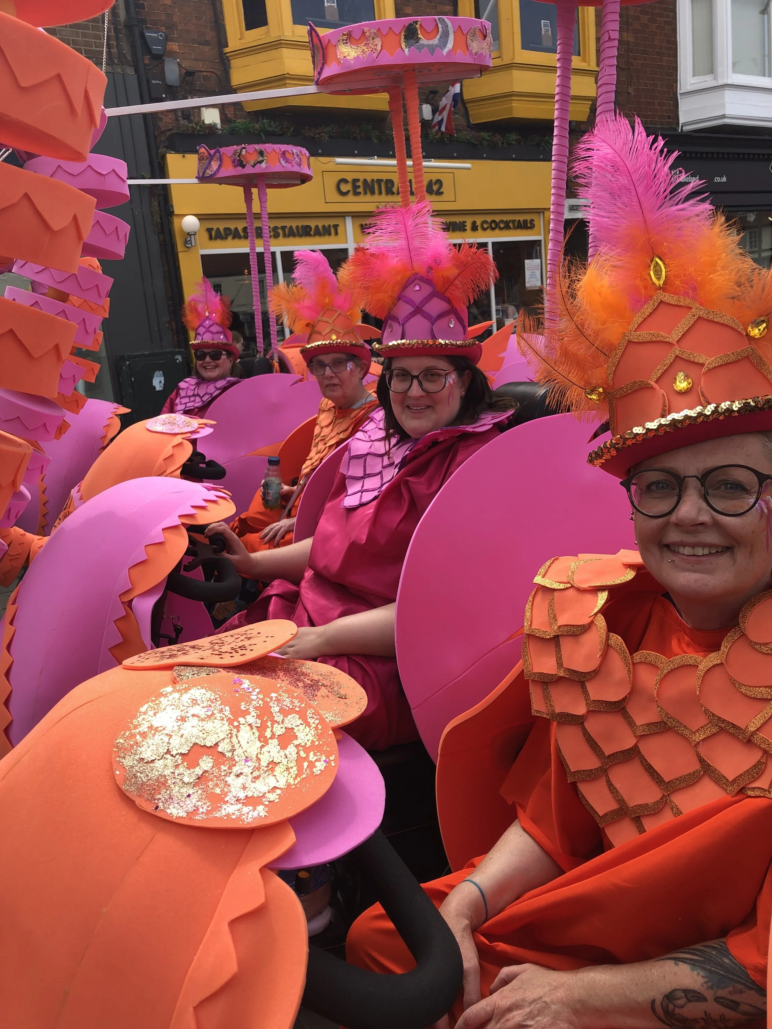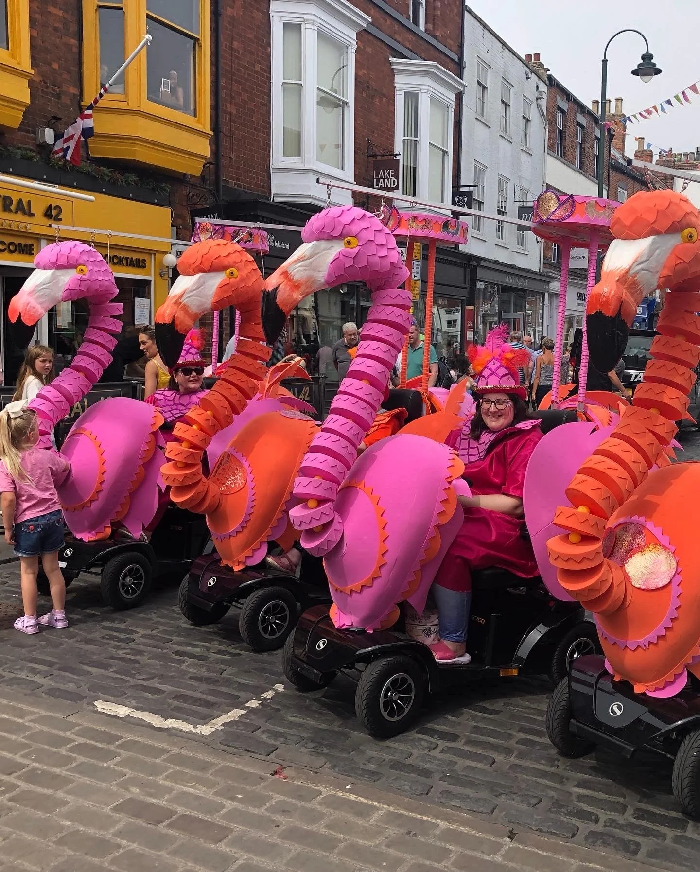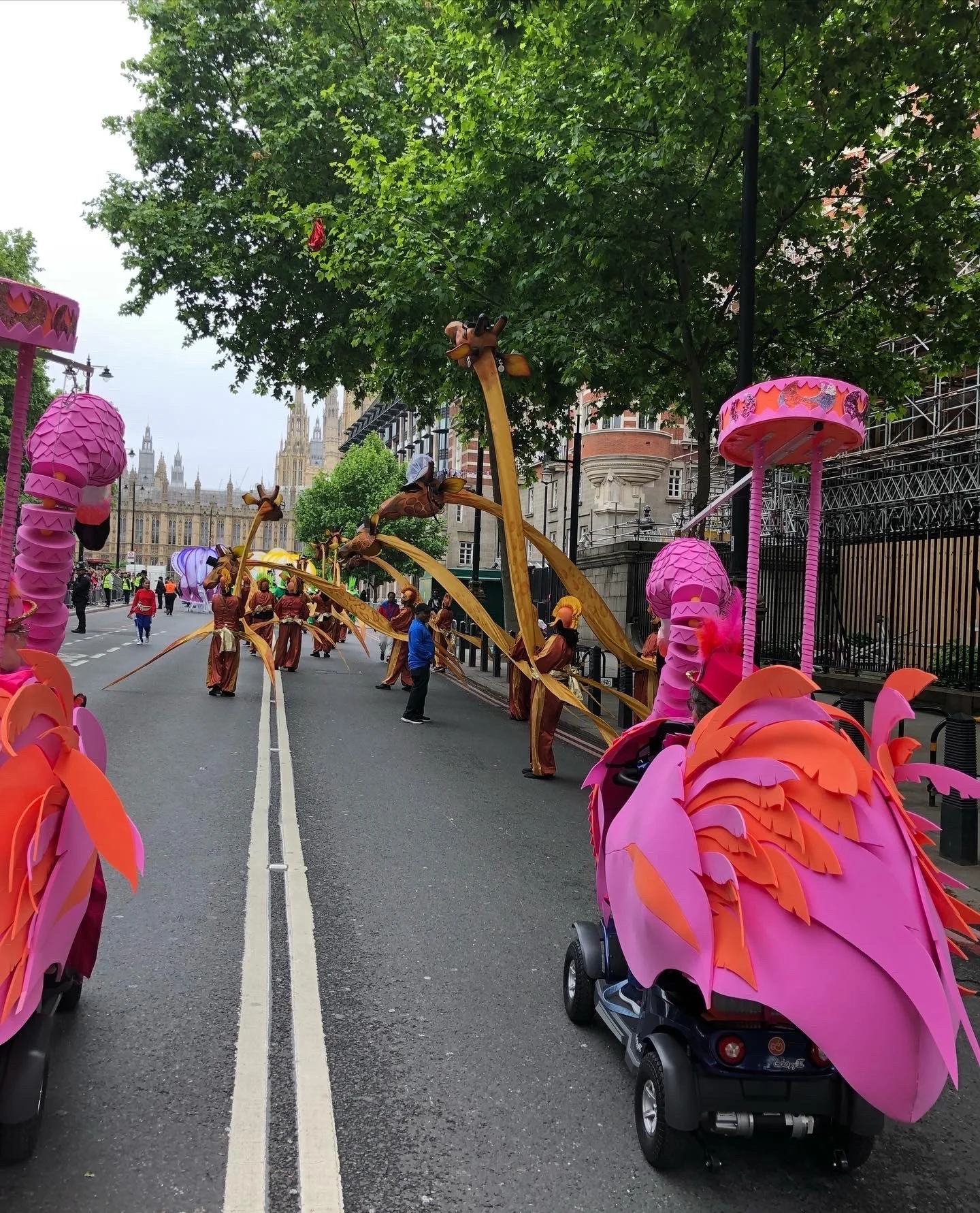 I worked as Design assistant and associate artist on the project, where I worked as part of the team to produce three Flamingo float/puppets that attach onto mobility scooters. The Flamingos had their Debut at Nottingham carnival, where I performed alongside them in one of city arts biana costumes. Since then we have gone on to complete a total of six flamingos and they have appeared a various events all over the country. In the summer of 2022 they appeared as part of the Mahogany troupe in the queens jubilee pageant parade in London.